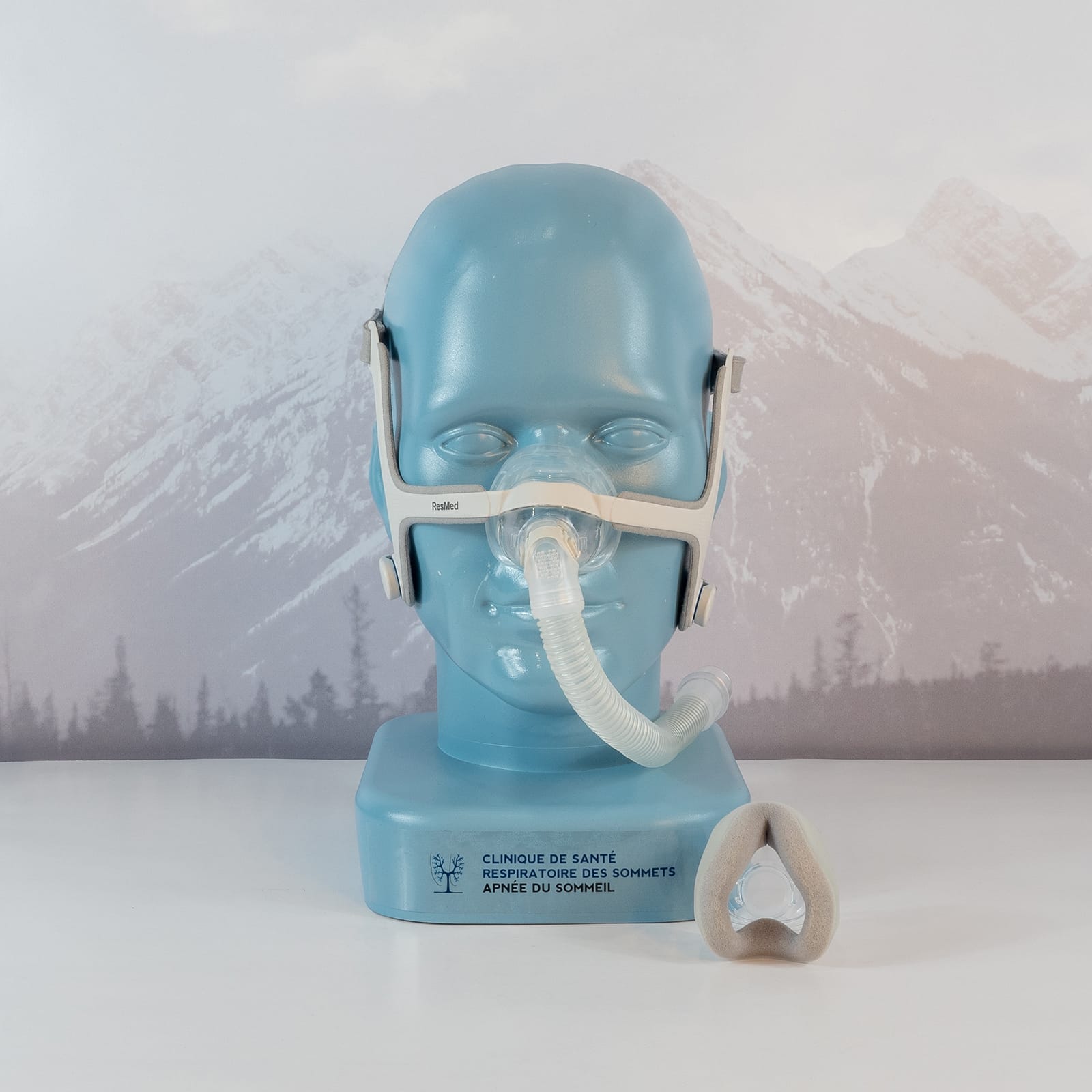 • Le contour modulaire est conçu pour que le coussin en mousse à mémoire de forme puisse être échangé facilement avec un coussin en silicone AirFit™ N20InfinitySeal™ de ResMed.